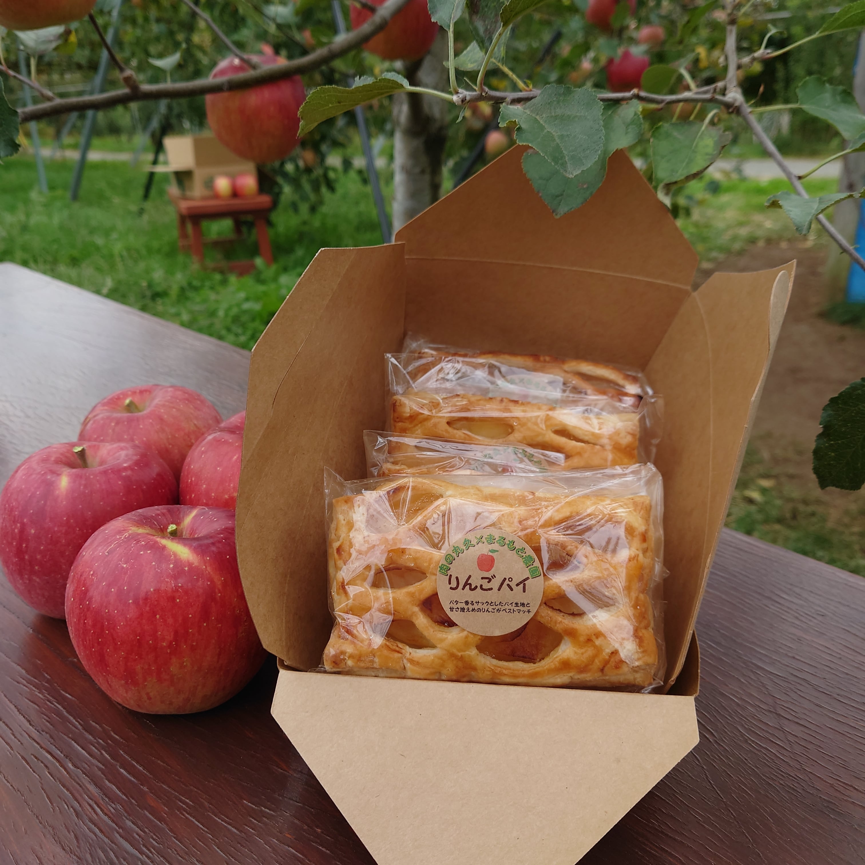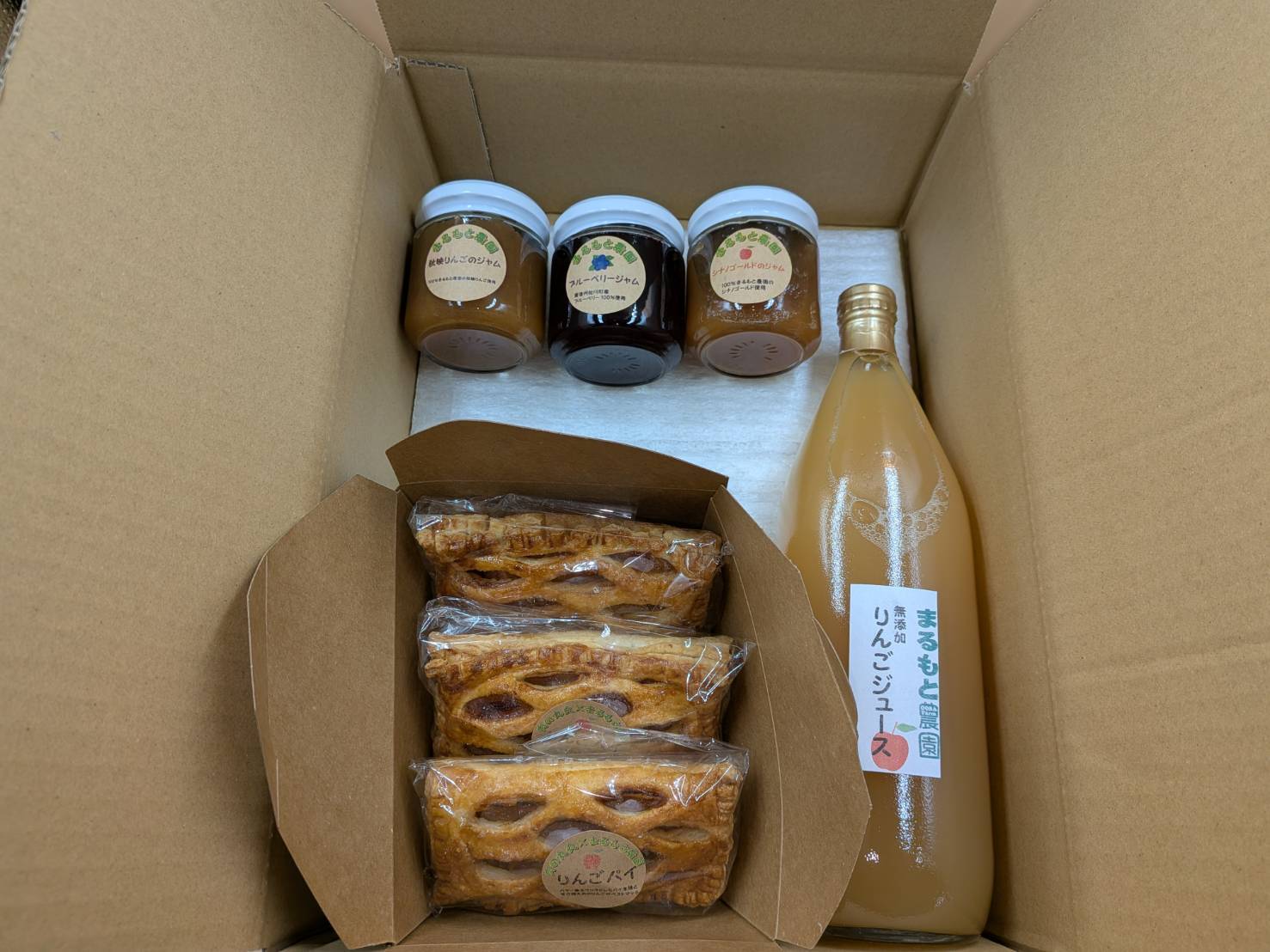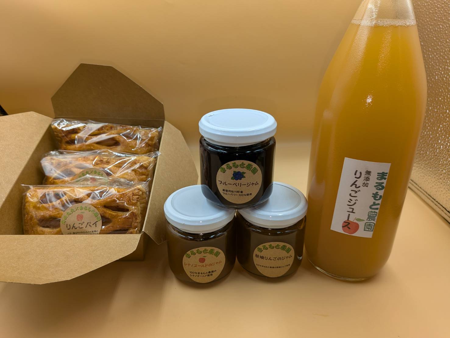 りんごパイ、りんごジュース、りんごジャム2種とブルーベリージャムの特別セット。